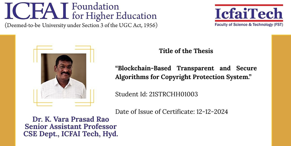 Award of PhD Degree in Electronics and Communication Engineering to Dr. Keerthi Somraj Under the Supervision of Dr. P. Akhendra Kumar, Senior Assistant Professor, Dept. ECE. Proceedings |